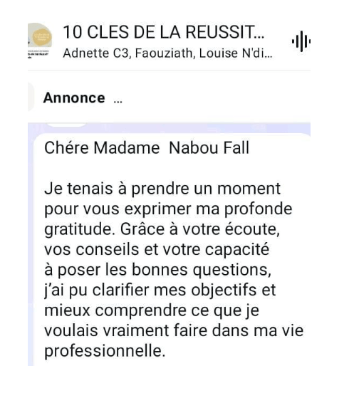 Nabou Fall partage avec générosité des outils concrets et durables, tout en créant un cadre sécurisant où chacun peut évoluer à son rythme. Cette formation va bien au-delà des promesses, et je la recommande vivement à tous les entrepreneurs et professionnels qui souhaitent construire un personal branding authentique et puissant. Merci, Nabou, pour cette expérience transformante.